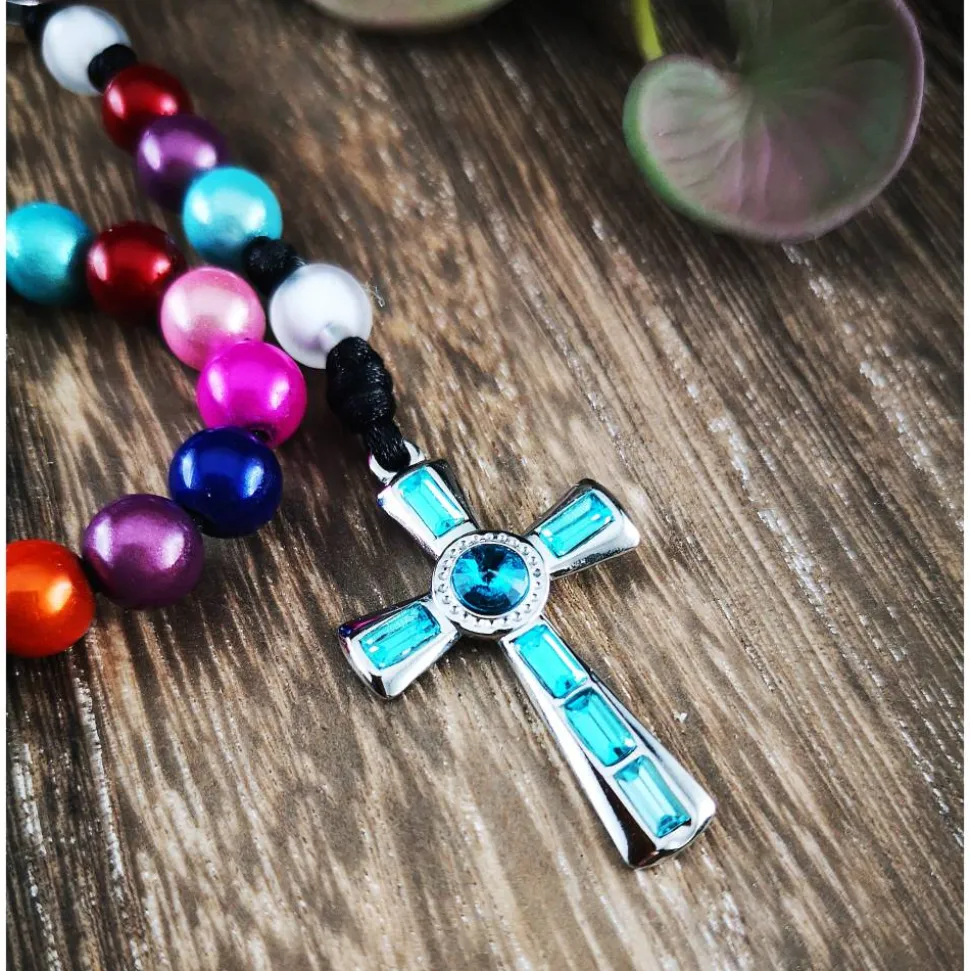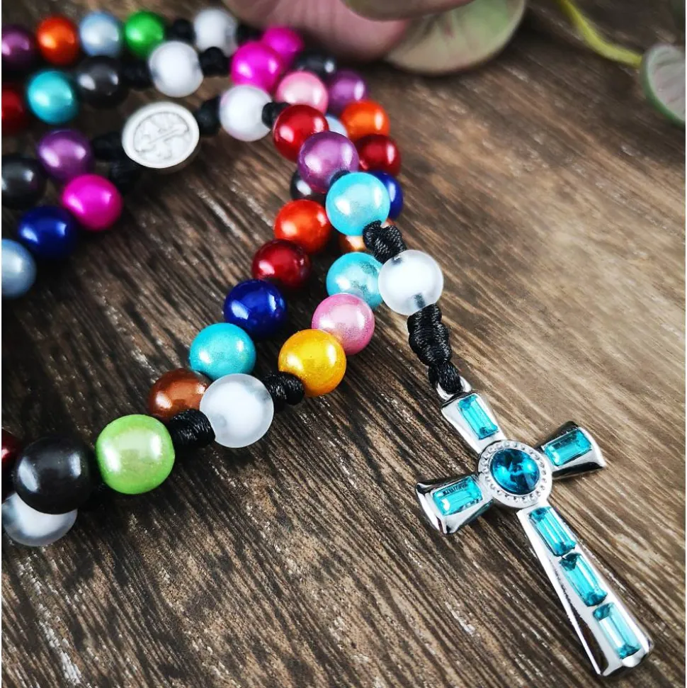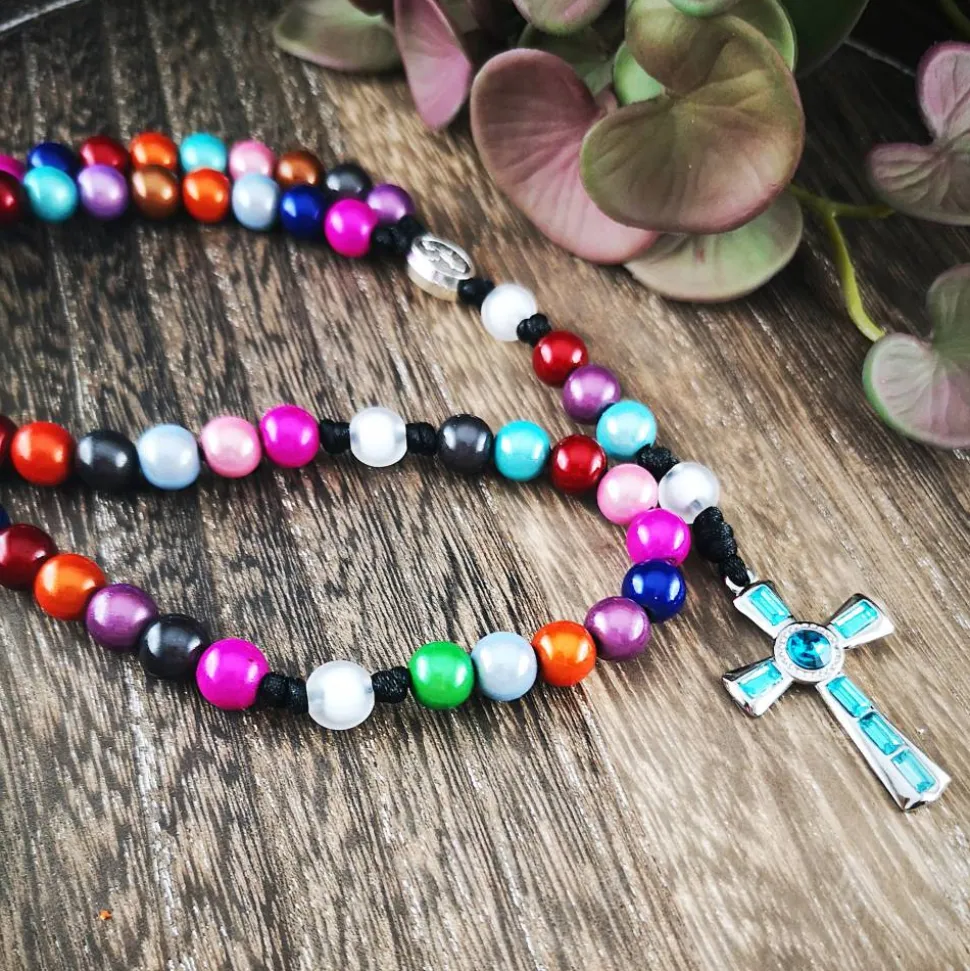 Der bunte katholische Rosenkranz mit Kreuzauswahl ist ein handgeknüpftes Stück, das nach Ihren Wünschen gefertigt werden kann.
