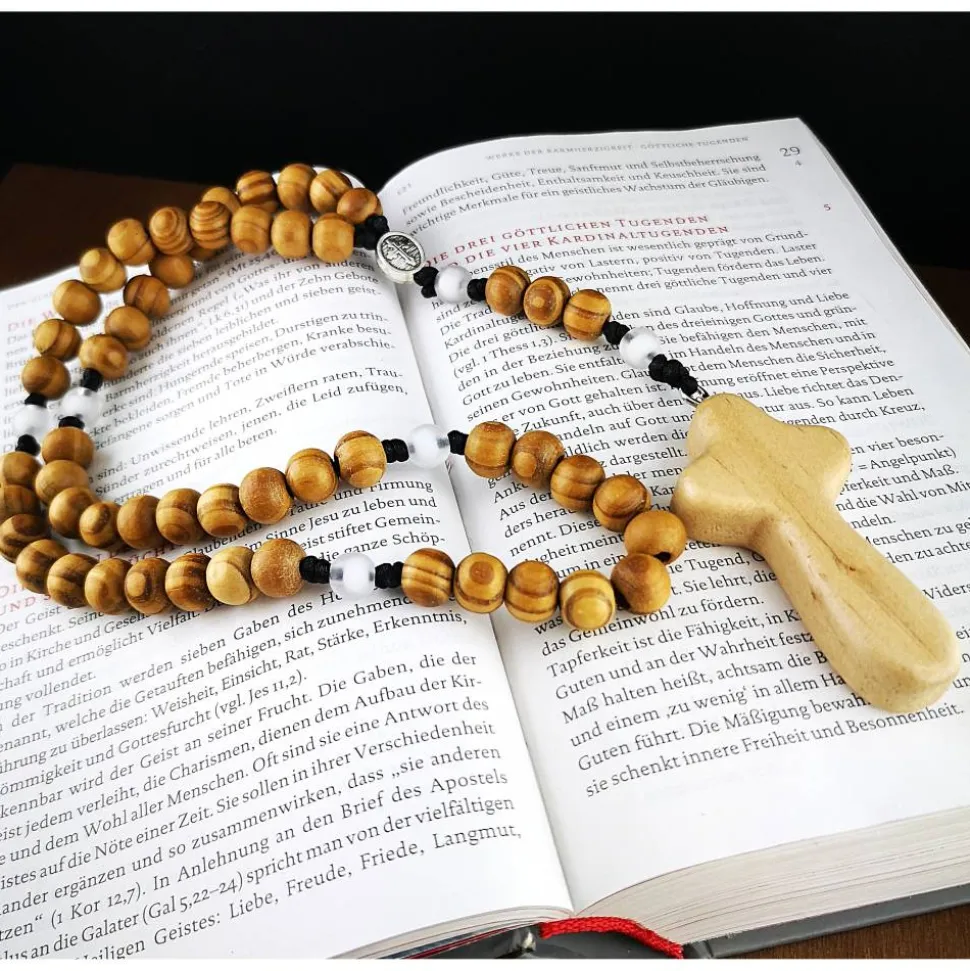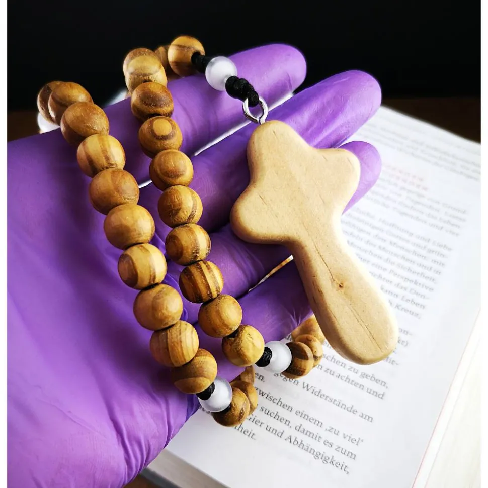 Die Kombination aus 10 mm Holzperlen und 8 mm matten Acrylperlen bildet einen wunderschönen Kontrast und verleiht dem Rosenkranz eine besondere Ausstrahlung.