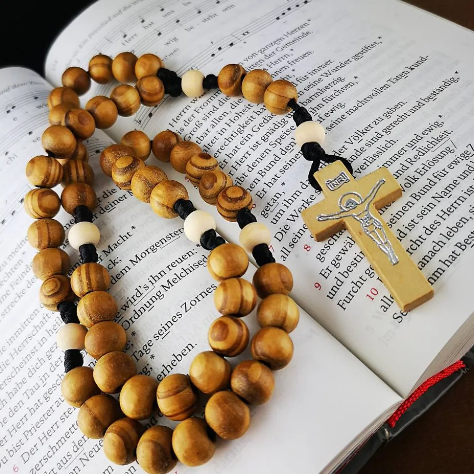 Die Kombination aus 6 und 8 mm Holzperlen bildet einen wunderschönen Kontrast und verleiht dem Rosenkranz eine besondere Ausstrahlung.