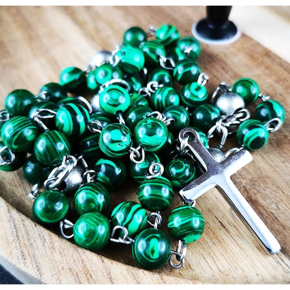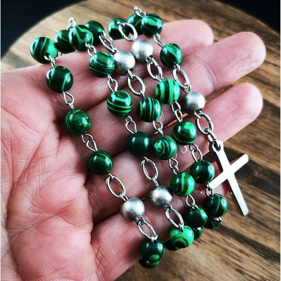 Die 8 mm großen Perlen sind in einem eleganten grün-silbernen Design angeordnet und werden von hochwertigen Edelstahl-Perlen, Kettelstiften, Verbindungsringen und einem schlichten Kreuz ergänzt.