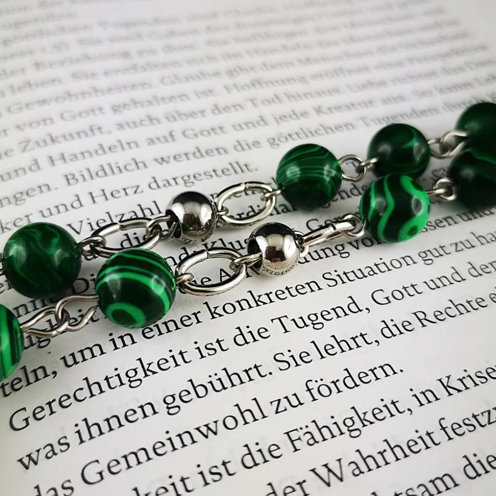 Entdecke den katholischen Rosenkranz mit synthetischen Malachitperlen und Edelstahl – ein wunderschönes und einzigartiges Schmuckstück, das Tradition und modernes Design harmonisch vereint.