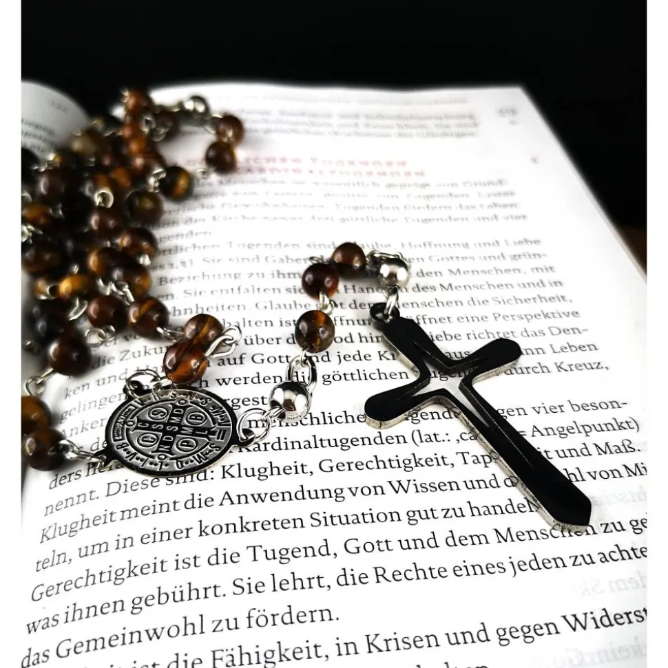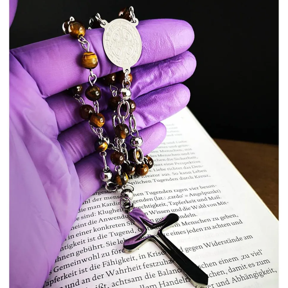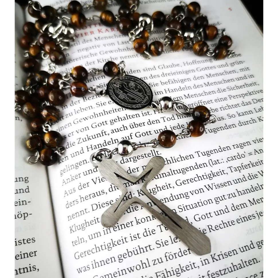 Entdecke den katholischen Rosenkranz aus Tigeraugeperlen und Edelstahl, der Tradition und modernes Design perfekt verbindet. Dieses spirituelle Accessoire ist zugleich ein extravagantes Schmuckstück, das alle Blicke auf sich zieht.
