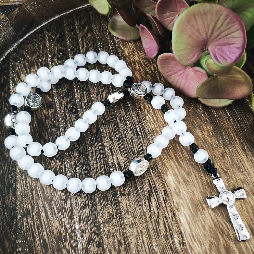 Er besteht aus 54 matten, weißen 8 mm Perlen und fünf Metallperlen mit Kreuzmotiv, die einen wunderschönen Kontrast bilden.