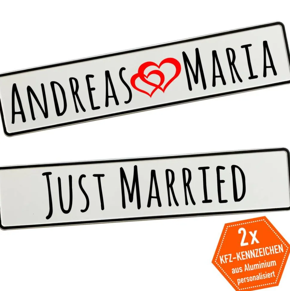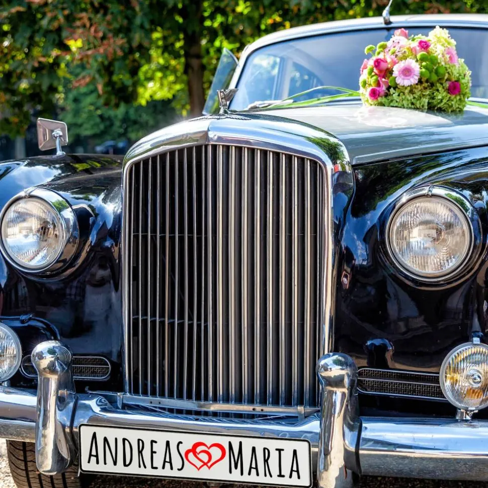 Du gibst einfach die gewünschten Namen an und wählst die passende Schriftart – wir fertigen dein persönliches Hochzeitskennzeichen mit viel Liebe zum Detail. Schon in kurzer Zeit hältst du deine individuelle Autodeko in den Händen.