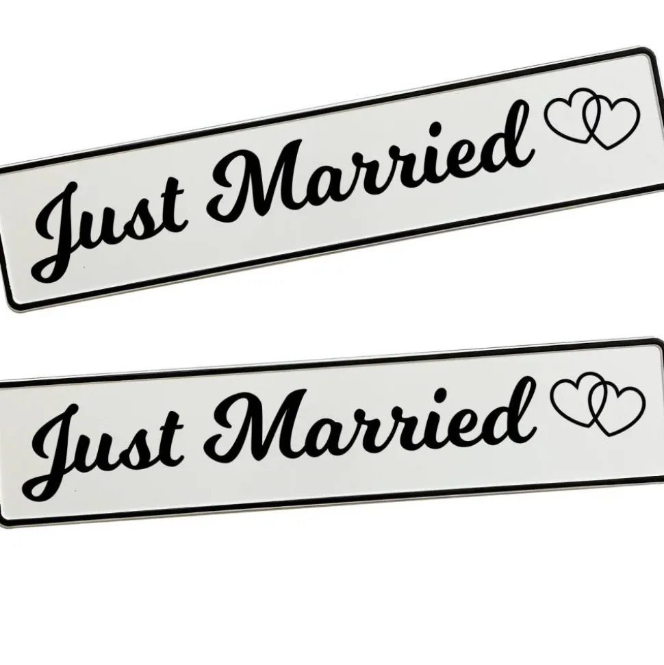 2x KFZ-Kennzeichen aus Aluminium, beschriftet mit Just Married und Motiv.