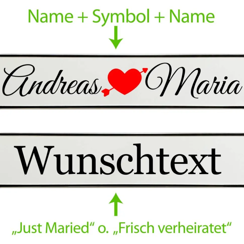 Stell dir vor, wie das Brautauto mit einem Schild glänzt, das eure Namen oder euren Wunschtext trägt. Damit wird dein Hochzeitsauto zur Bühne für den großen Auftritt.