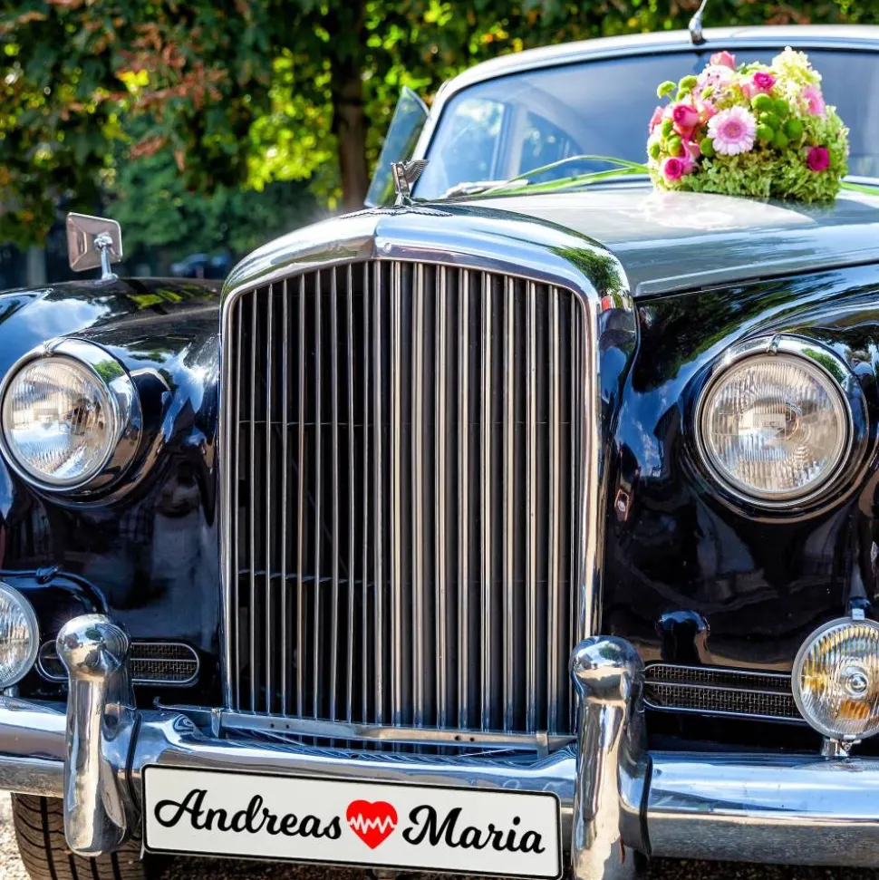 Stell dir vor, wie das Brautauto mit einem Schild glänzt, das eure Namen oder euren Wunschtext trägt. Damit wird dein Hochzeitsauto zur Bühne für den großen Auftritt.