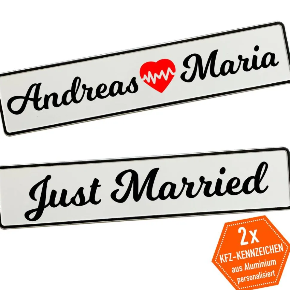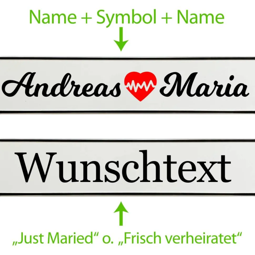 Du gibst einfach die gewünschten Namen an und wählst die passende Schriftart – wir fertigen dein persönliches Hochzeitskennzeichen mit viel Liebe zum Detail. Schon in kurzer Zeit hältst du deine individuelle Autodeko in den Händen.