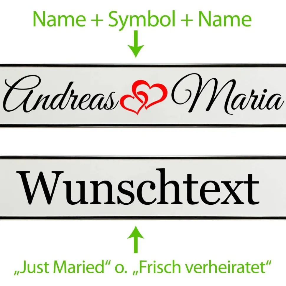 Stell dir vor, wie das Brautauto mit einem Schild glänzt, das eure Namen oder euren Wunschtext trägt. Damit wird dein Hochzeitsauto zur Bühne für den großen Auftritt.