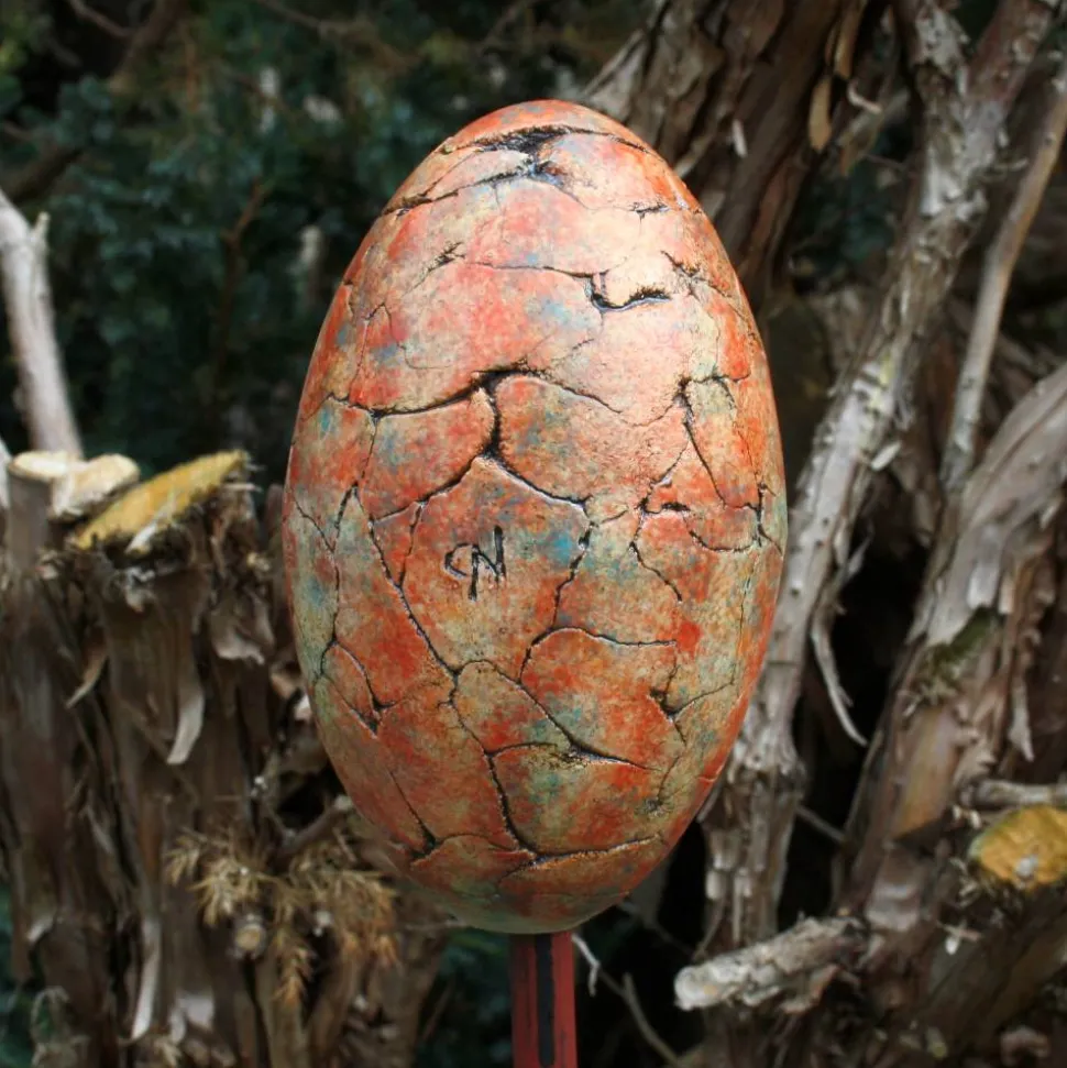 Das Ei wurde freihand ausgeformt. So ist jedes Ei durch die individuelle Rissbildung ein ganz besonderes Einzelstück.
