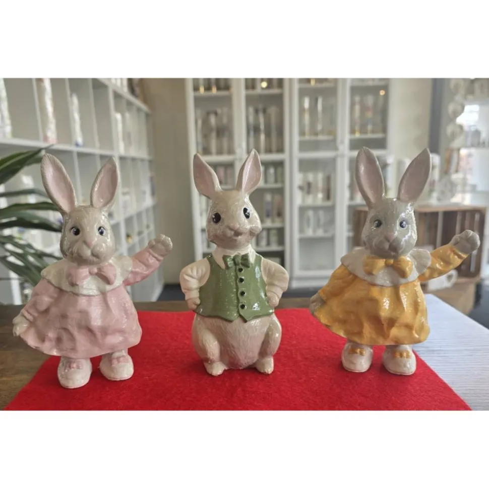 Die drei Osterhasen aus Keramik sind handbelalt und glasiert.