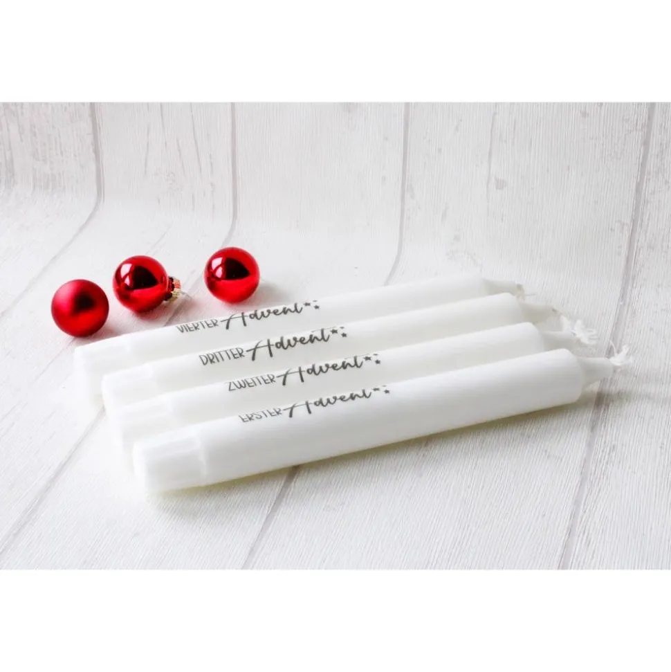 Hier ist ein von mir liebevoll, gefertigtes Adventskerzen-Set in Weiß mit einem Schriftzug in Schwarz. Die Kerzen werden unverpackt geliefert. Bei einer größeren Bestellmenge verlängert sich die Lieferzeit. Die Kerzen eignen sich perfekt zur individuellen Gestaltung Eurer Adventskränze.