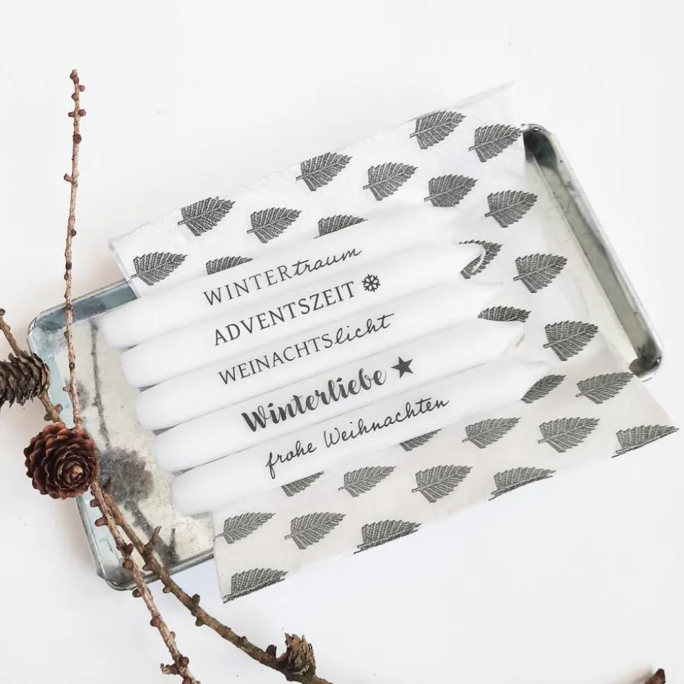 Die weißen Kerzen mit schönen Sprüchen und Motiven sind ca. 16 cm lang und haben einen Durchmesser von ca. 2 cm.