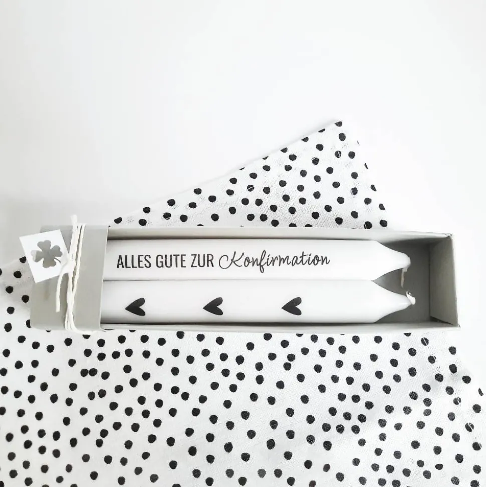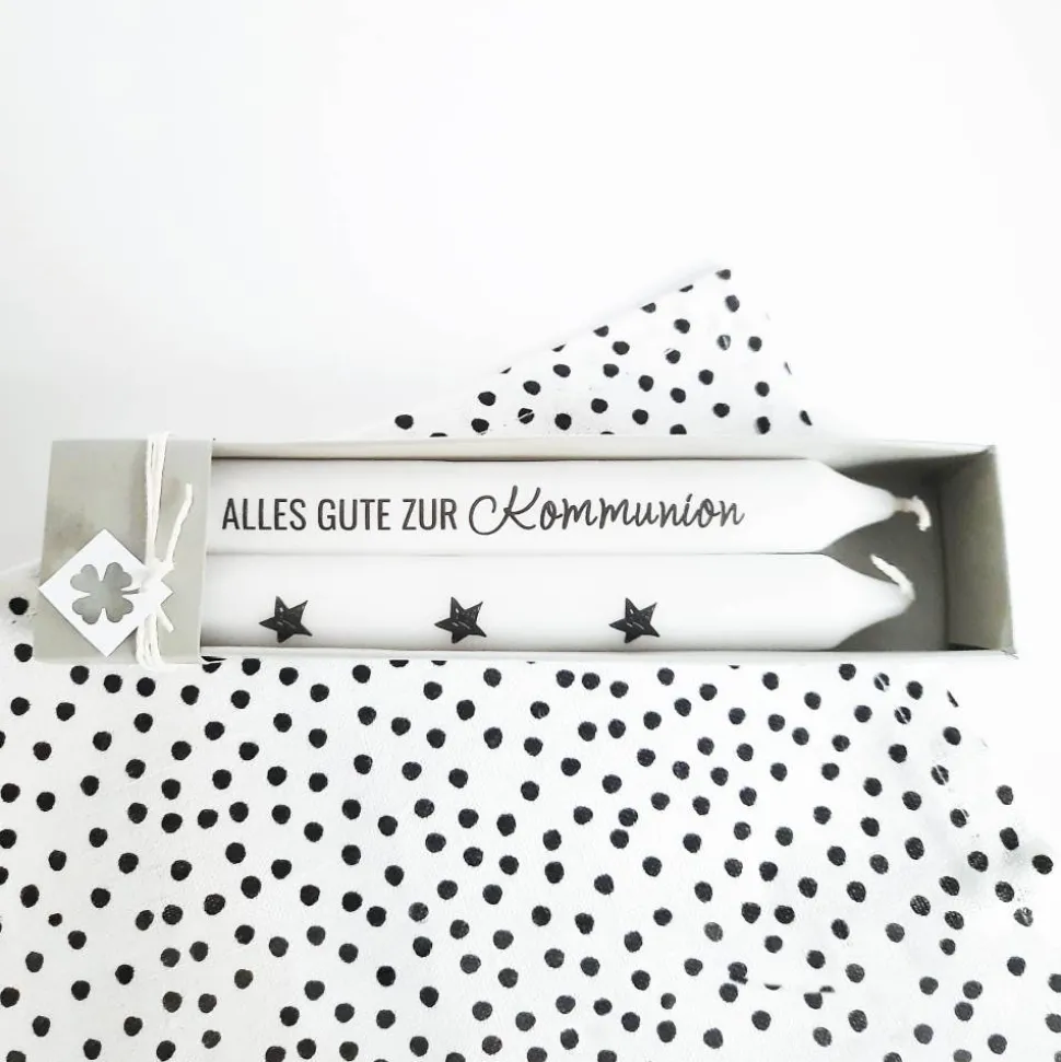 Die beiden weißen Kerzen mit dem Schriftzug „Alles Gute zur Kommunion“ oder „Alles Gute zur Konfirmation“, Stern- oder Herzmotiv sind ca. 16 cm lang und haben einen Durchmesser von ca. 2 cm.