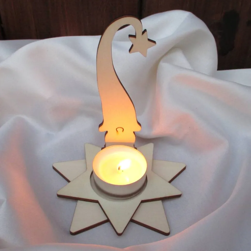Das Steckset besteht aus drei Teilen: der 11 cm große Wichtel Eberhard wird erst in den Schlitz des 9 cm breiten oberen Sterns gesteckt (das ist der mit dem Loch für das Teelicht), dann in den Schlitz des gut 10 cm breiten unteren Sterns – FERTIG!