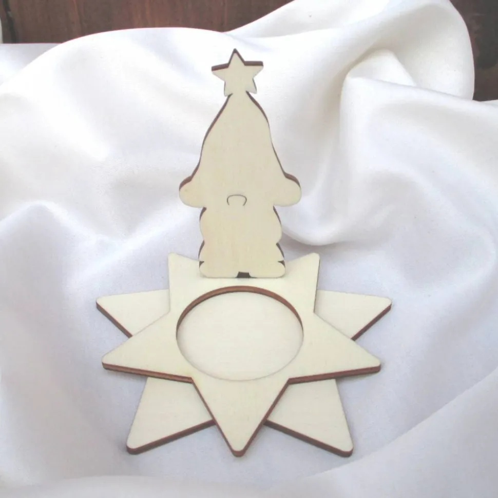 Das Steckset besteht aus drei Teilen: der insgesamt 8,5 cm große Wichtel Egon wird erst in den Schlitz des 9 cm breiten oberen Sterns gesteckt (das ist der mit dem Loch für das Teelicht), dann in den Schlitz des gut 10 cm breiten unteren Sterns – FERTIG!