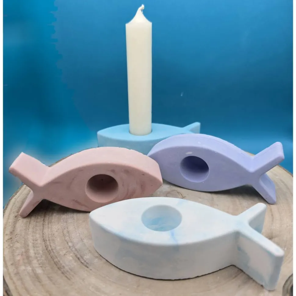 Setze stilvolle Akzente mit dem handgegossenen Kerzenhalter Fisch aus hochwertigem Raysin in zarten Pastellfarben.