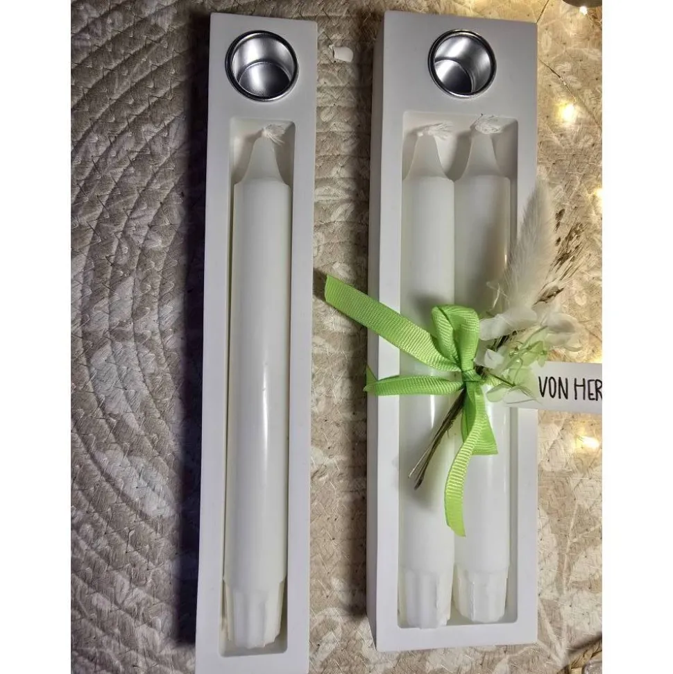 Wähle zwischen Einzel- oder Doppelhalter – beide Varianten werden mit passenden weißen Stabkerzen geliefert. Besonders liebevoll: Die Doppelhalter-Variante ist auf dem Produktfoto mit einer zarten Schleife und dekorativen Trockenblumen verziert und setzt damit einen ganz besonderen Akzent.