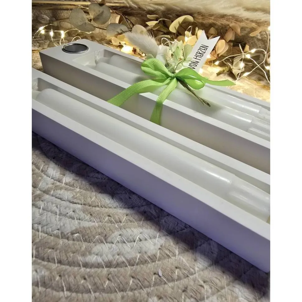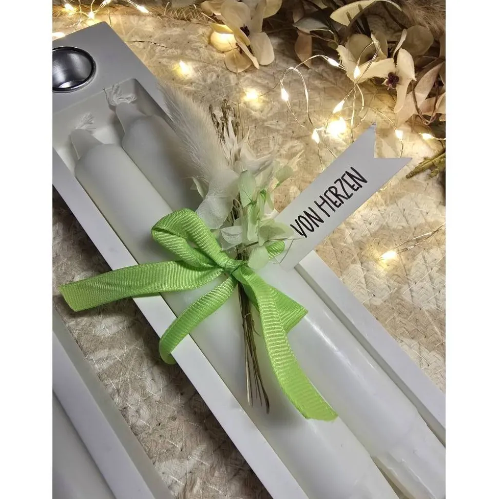 Das Set eignet sich perfekt als Geschenk von Herzen, als stilvolle Tischdekoration oder als Zeichen der Verbundenheit. Optional kannst du es mit Trockenblumen und einer persönlichen Botschaft auf einem Zettel bestellen. Auf Wunsch bringe ich auch eine Aufschrift auf die Kerzen an.