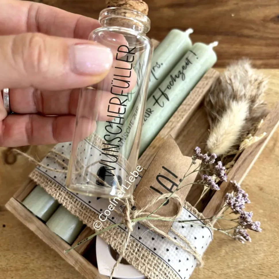 Auf dem Glas befindet sich der Schriftzug „Wunscherfüller“ (auf Wunsch auch ohne Text). Das gesamte Geschenk wird liebevoll mit einem breiten Juteband, einer edlen Banderole aus Transparentpapier und einem Schildchen mit dem Wort „JA!“ umwickelt. So bleiben die Stabkerzen, das Glasröhrchen und der herzförmige Kerzenhalter sicher an ihrem Platz.