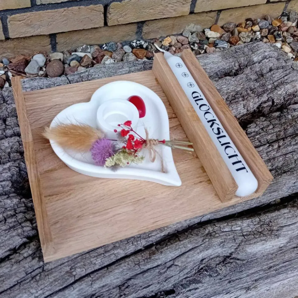 Für das kleine Geschenk habe ich in liebevoller Handarbeit aus weißem Raysin einen herzförmigen Kerzenhalter gegossen. Dazu gibt es die schöne weiße Stabkerze mit der Aufschrift „Glückslicht“.