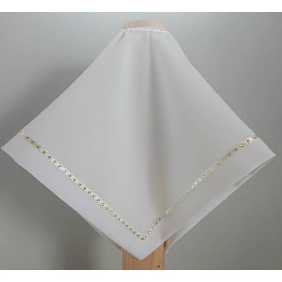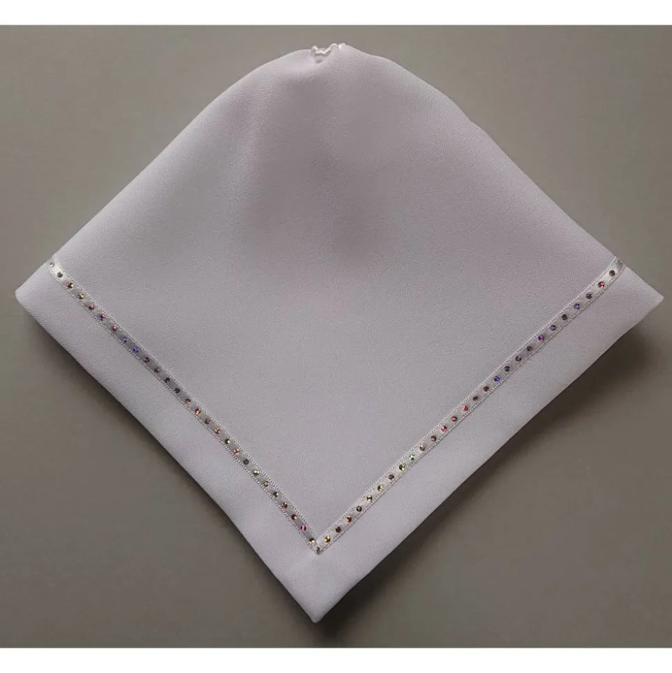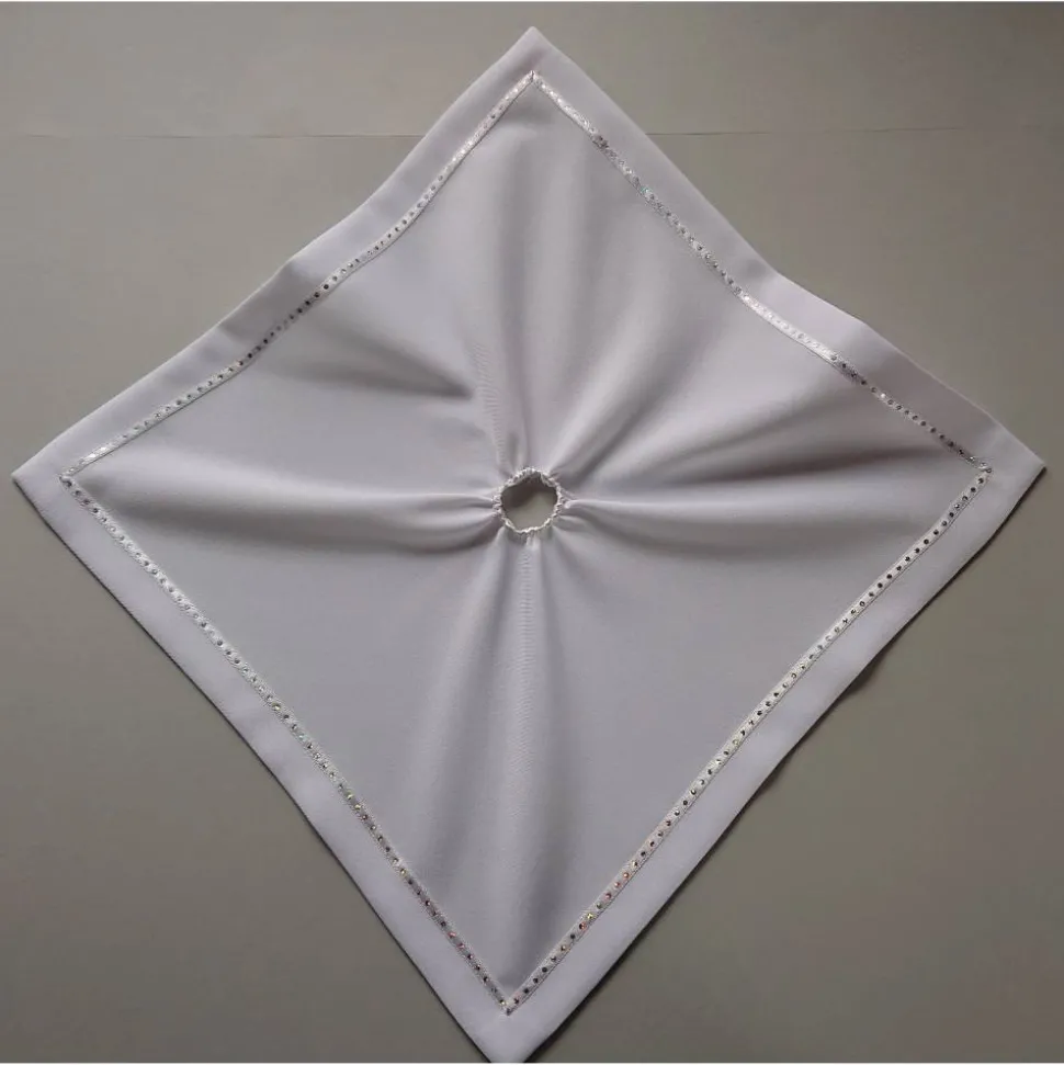 – Das Tuch ist eckig mit aufgenähtem Band.