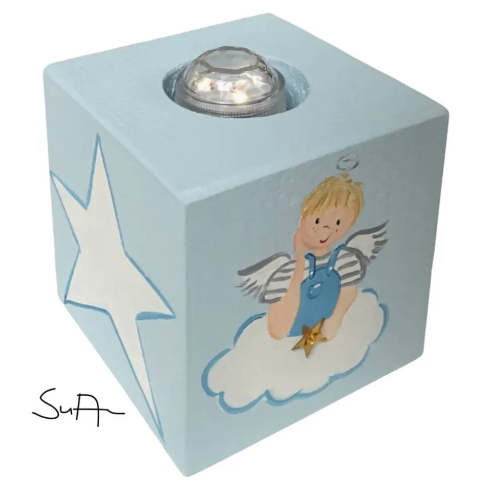 Der Schutzengel-Teelichtwürfel eignet sicht mit einem LED Teelicht sehr gut als Schlummerlicht.