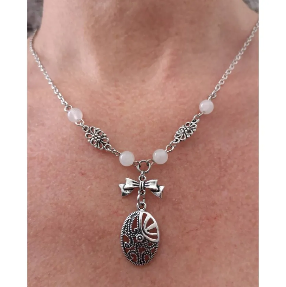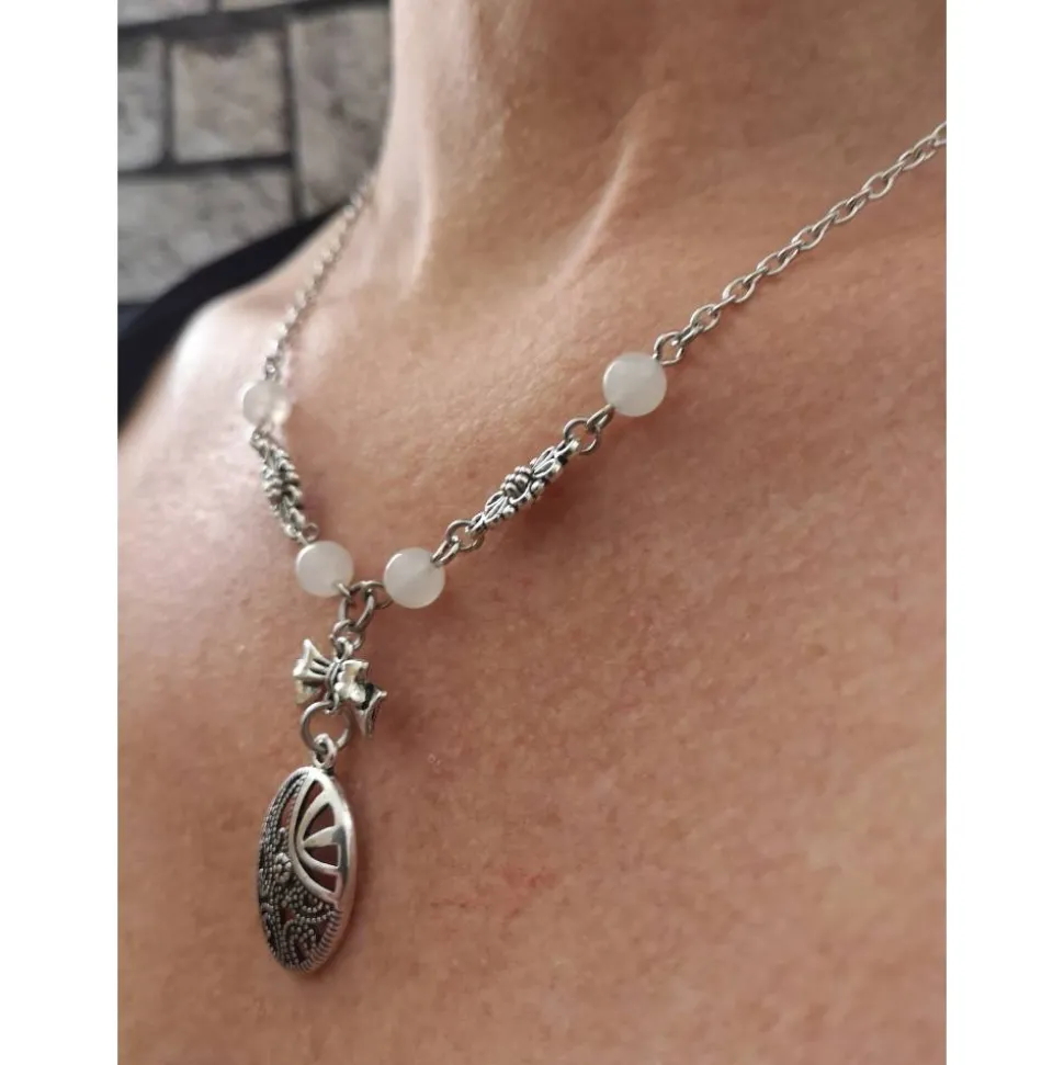 Zu schließen ist die Kette mit einem Karabinerhaken, wo ebenfalls ein kleiner Schmuckanhänger ist.