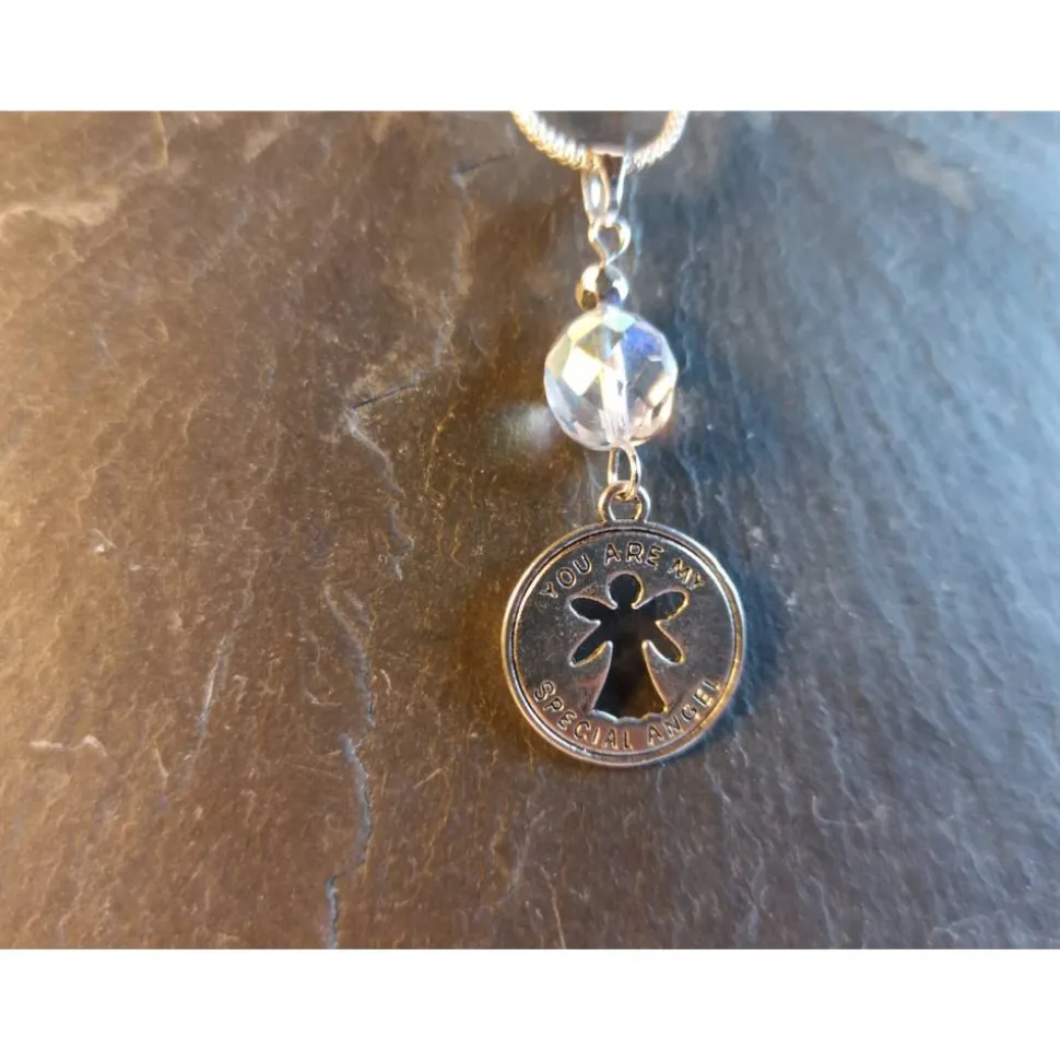 Der Anhänger besteht aus versilbertem Metall und ist mit dem liebevoll eingravierten Text „You are my special angel“ sowie einem ausgestanzten Engel versehen. Eine böhmische, transparente, facettierte Glasperle (feuerpoliert, irisierend) rundet das Design ab.