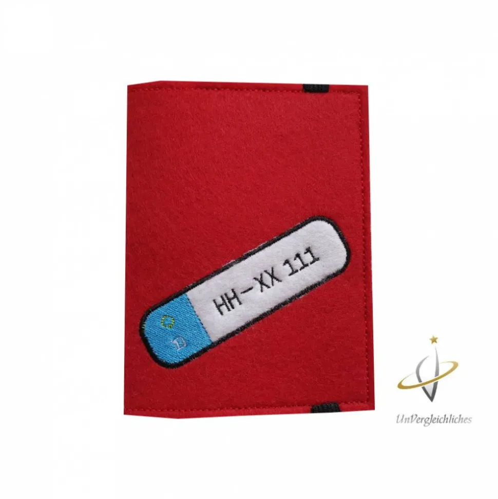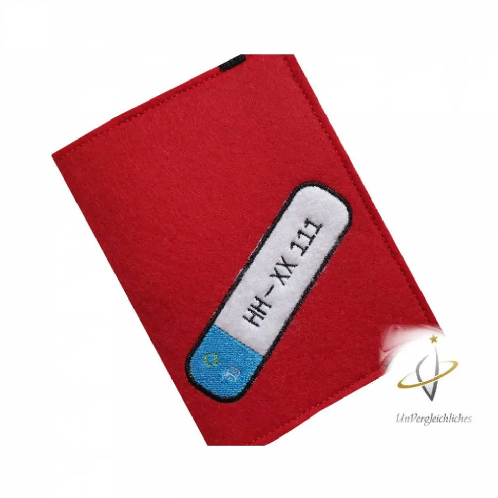 Die Hülle ist aus 2 mm dickem stabilen Filz genäht und mit eurem Wunschkennzeichen bestickt. Ein super individuelles Geschenk für jeden Anlass 😉