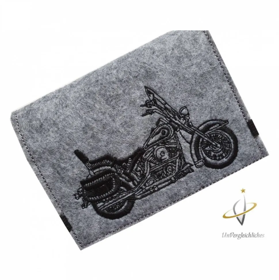 Die Hülle ist aus 2 mm dickem stabilen Filz genäht und mit eurem Wunschkennzeichen bestickt. Ein super individuelles Geschenk für jeden Anlass 😉