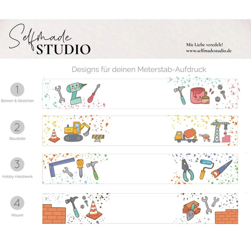 Entdecke den personalisierbaren Kinder Meterstab Baustelle – das ideale Geschenk für kleine Handwerker, kreative Mini-Bauherren und fleißige Helfer. Der bunt bedruckte Zollstock ist nicht nur ein hochwertiges Werkzeug, sondern auch ein liebevoll gestaltetes Erinnerungsstück.