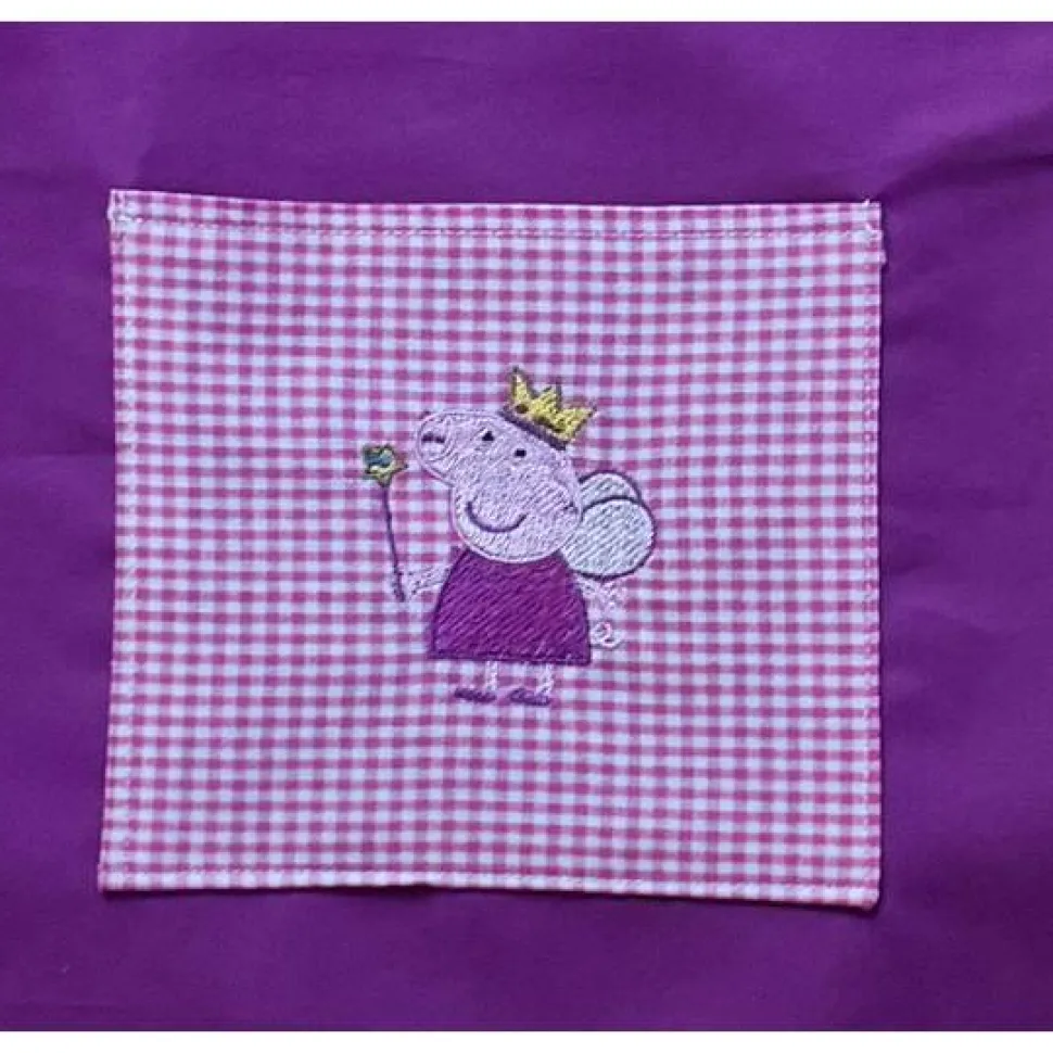 Sie besteht aus einem weichen, beerenfarbigem Baumwoll-Stoff und erhält mit der aufgesetzten Tasche aus zart kariertem Stoff ein besonders niedliches Detail. Die Rückseite ist aus dem gleichen karierten Stoff, wie die bestickte Tasche.