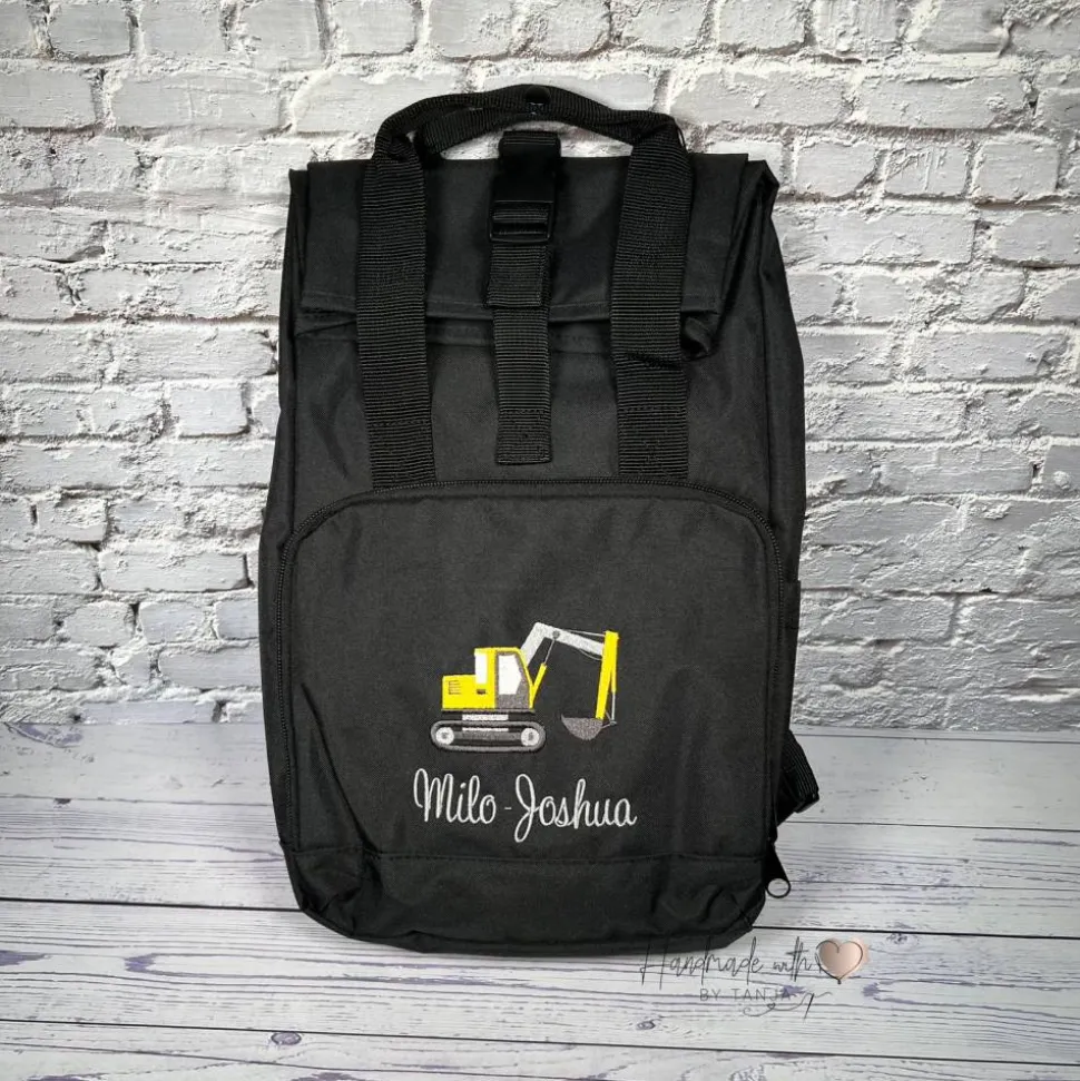 Kinder Rolltop Rucksack mit Bagger & Namen bestickt I personalisierte Kita-Tasche I Kindergartentasche für Jungen