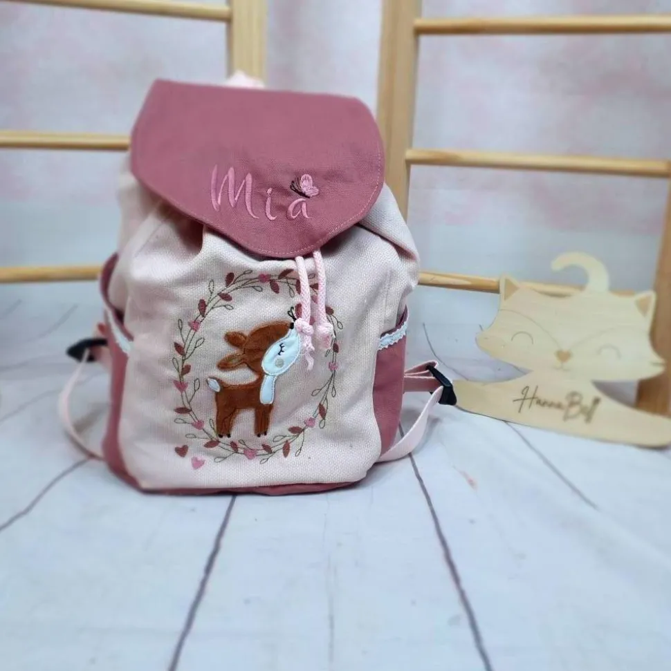Hier im Beispiel ist es ein Rucksack in einem Strukturcanvas in hellrosa kombiniert mit einem Unicanvas in Altrosa. Bestickt ist der Rucksack mit einem Rehkitz im Blümchenrahmen von Stickherz. Du kannst aber aus vielen verschiedenen Applikationen wählen – schau doch bitte mal in die Bilder 🙂