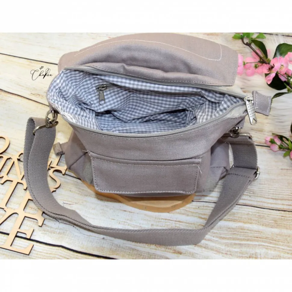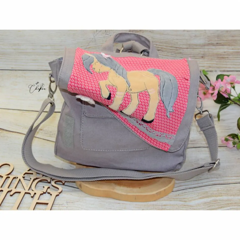 Kindergartenrucksack in Grau, der auch als Umhängetasche oder Henkeltasche verwendet werden kann, somit auch mit wächst.