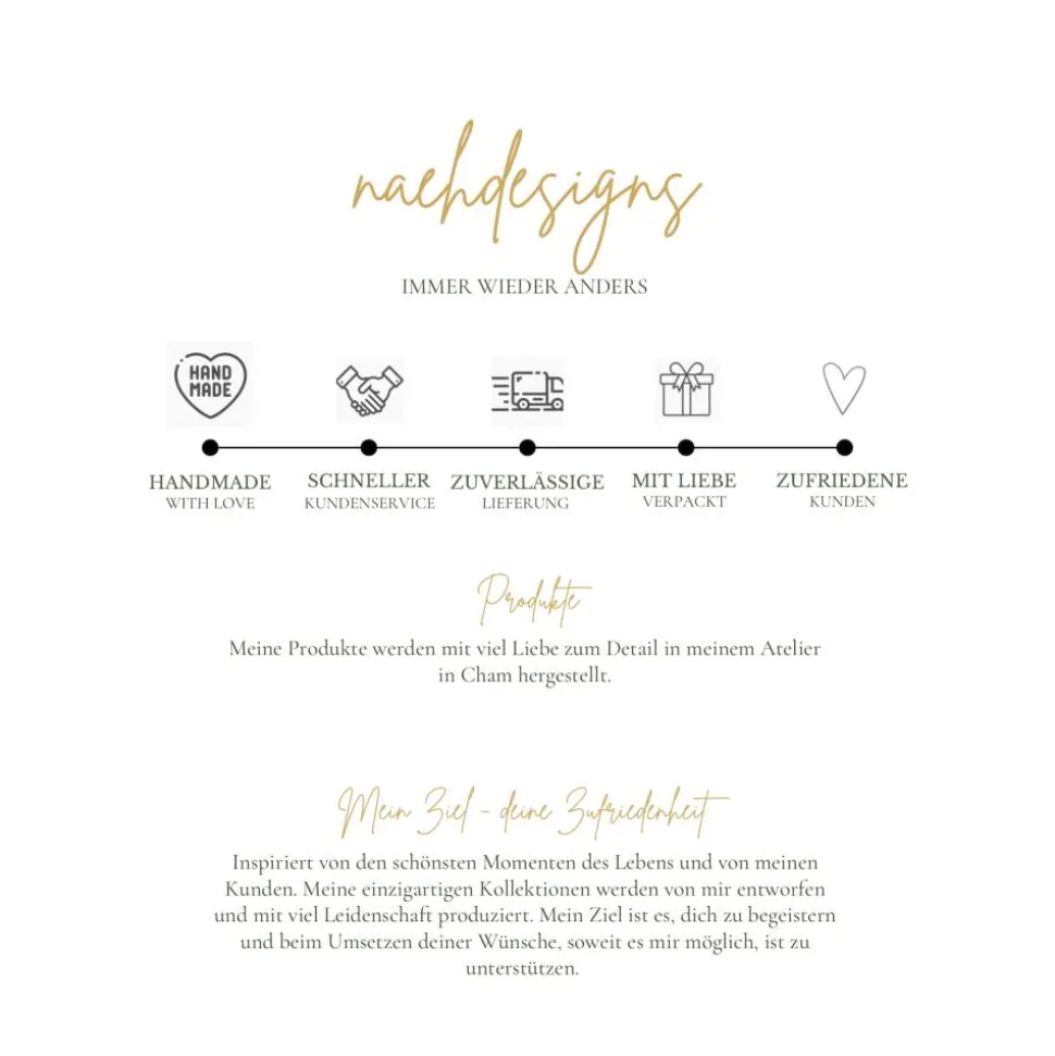 Inspiriert von den schönsten Momenten des Lebens und von meinen Kunden. Meine einzigartigen Kollektionen werden von mir entworfen und mit viel Leidenschaft produziert. Mein Ziel ist es, dich zu begeistern und beim Umsetzen deiner Wünsche soweit es mir möglich ist zu unterstützen. Sonderwünsche aber bitte immer vorab mit mir abklären. Ich versuche diese gern umzusetzen.