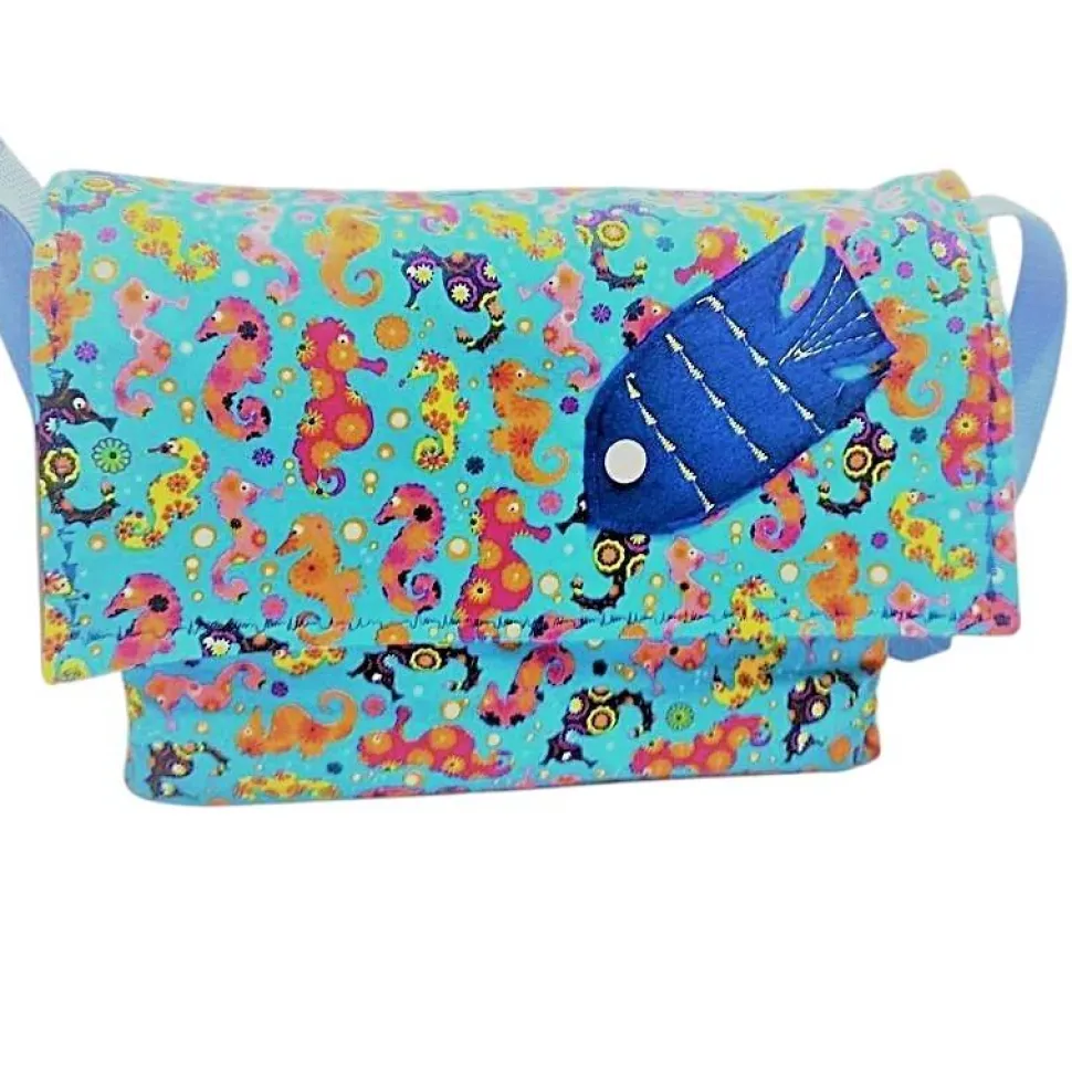 Süße Kindergartentasche mit Fisch-Applikation. Die Tasche hat genügend Stauraum für das Vesper und ein Kuscheltier. Der Umhänge Gurt ist verstellbar. Auch Handtaschen tauglich. Die Tasche ist aufgrund seiner Details vielseitig einsetzbar, ob als Kindergartentasche, Umhängetasche für kleine Damen, es gibt viele Möglichkeiten. Die Tasche wird mit einem Druckknopf verschlossen.