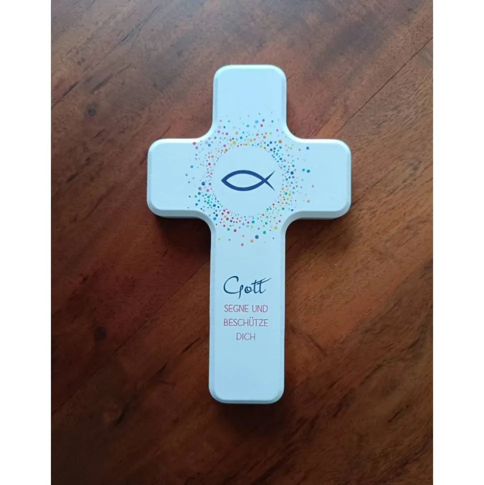 Bei diesem robusten Kreuz für Kinder handelt es sich um ein Unikat, das in einer hochwertigen Geschenkverpackung geliefert wird. Es eignet sich als liebevolle Geschenkidee für die Kommunion.