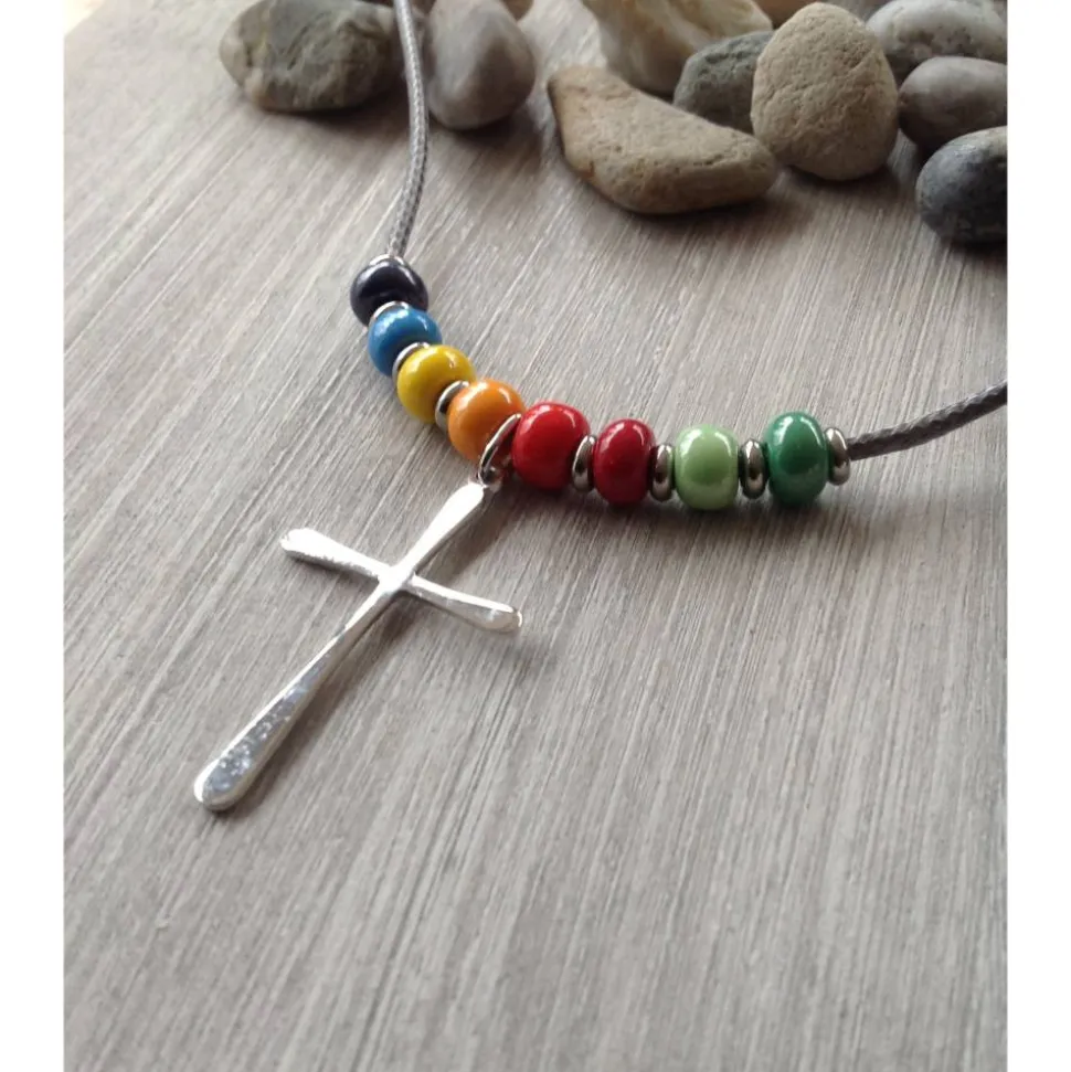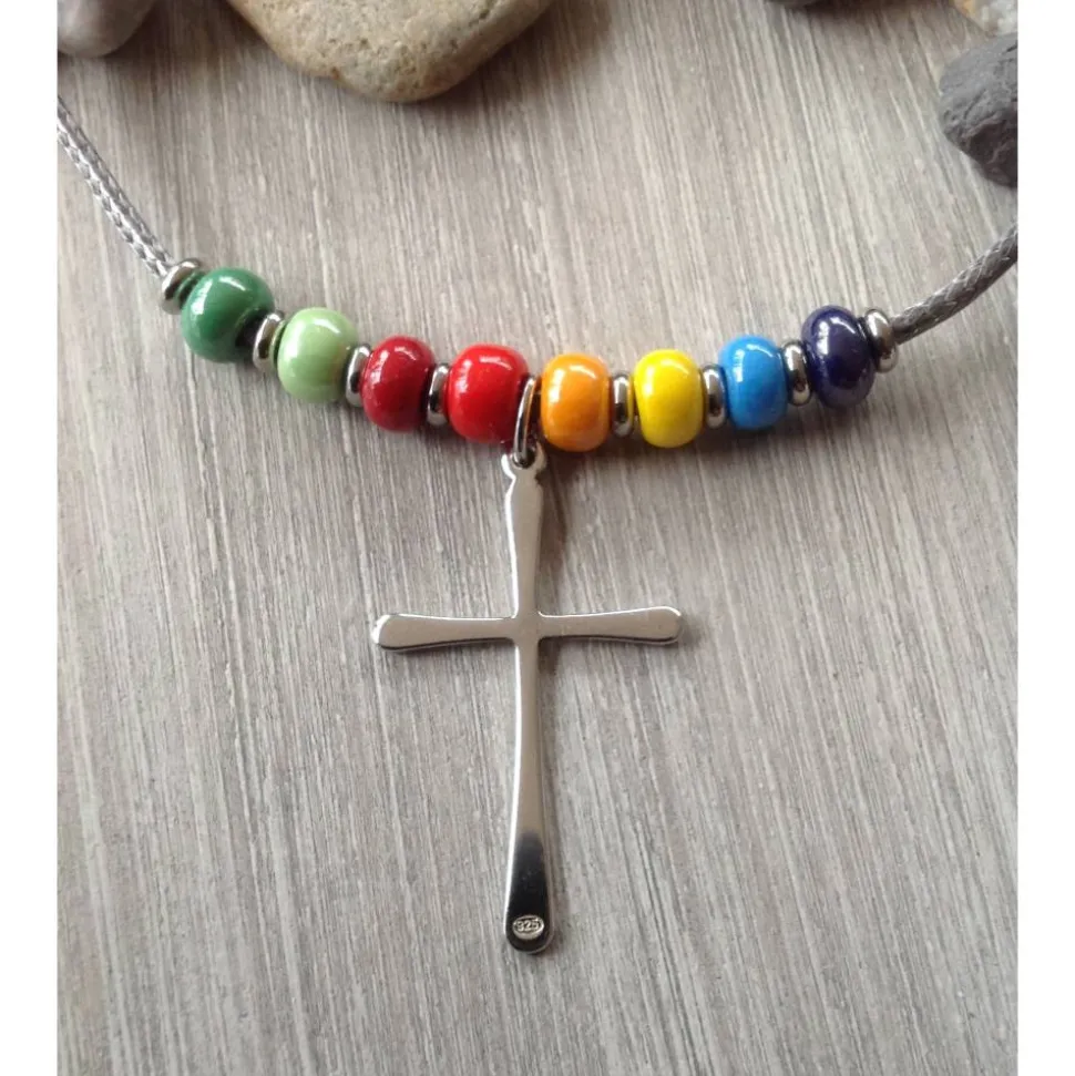 Die Kette ist aus grauer Nylonschnur ( ca 2mm stark ) hergestellt. Die Länge ist durch die Schiebeknoten variabel Verziert ist sie mit bunten Rocailles ( Durchmesser ca 5mm ) Edelstahlperlen und einem schlichten Kreuz ( Höhe 3,5 cm ). Der Kreuzanhänger wurde bereits getragen und kann daher kleine Kratzer aufweisen.
