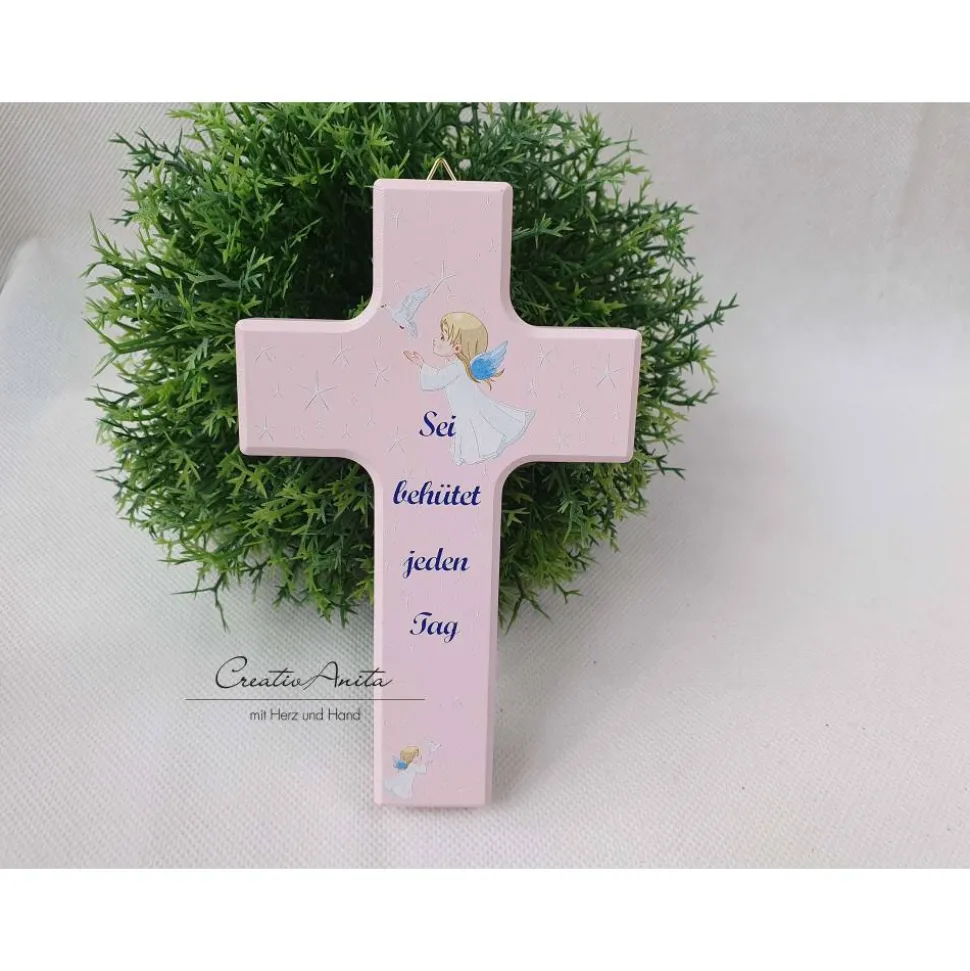 Holzkreuz zur Geburt oder Taufe mit einem Engelchen, das gerade eine Taube fliegen lässt. Um den Engel herum scheinen zarte Sternchen.