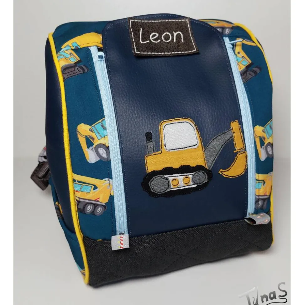 Wie man auf dem letzten Foto sieht, kann ich ein Lederlabel mit dem Namen des Kindes herstellen und auf den Rucksack nähen. Hier für die Fotos habe ich das provisorisch mit dem Namensschild LEON gemacht.