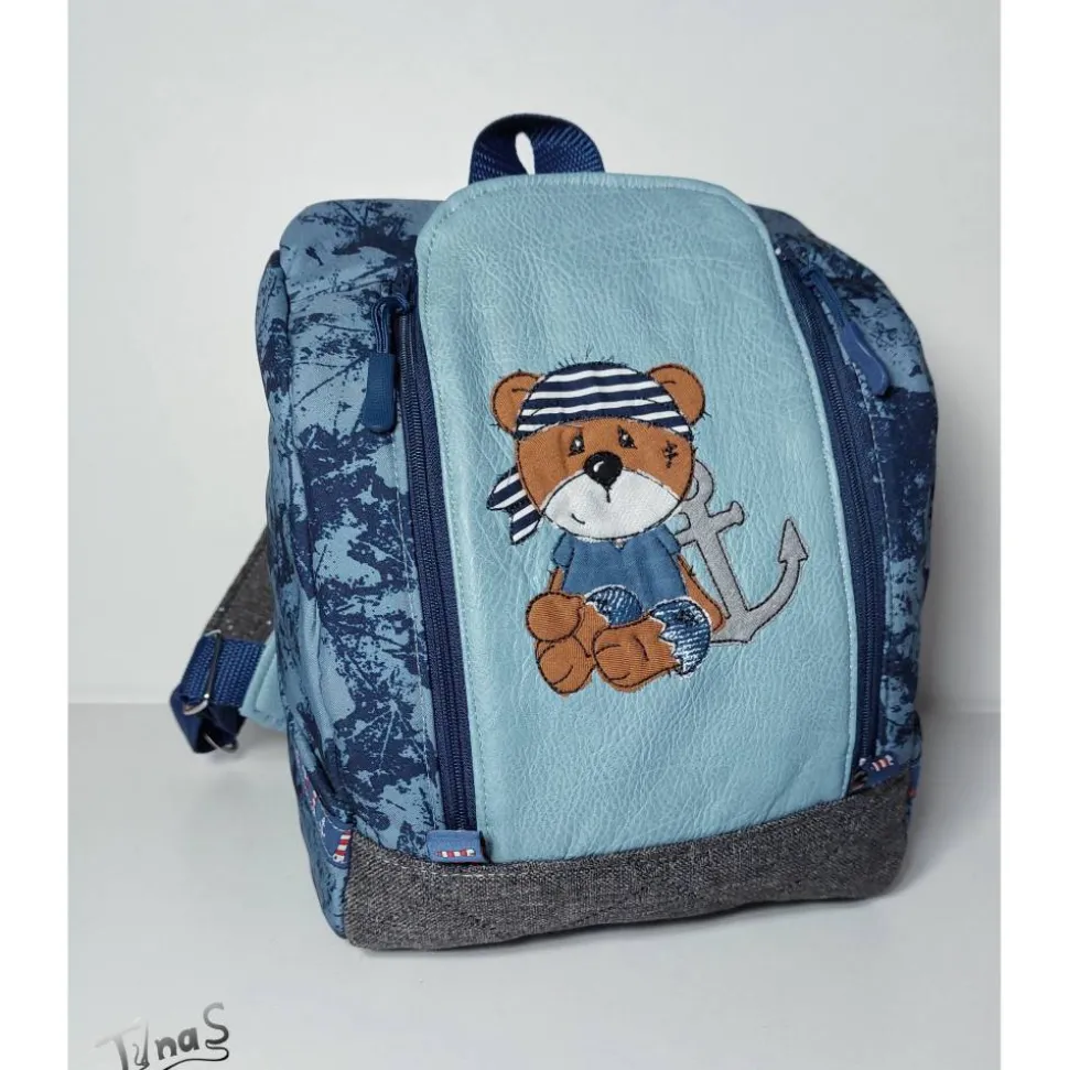 Wie man auf dem letzten Foto sieht, kann ich ein Lederlabel mit dem Namen des Kindes herstellen und auf den Rucksack nähen. Hier für die Fotos habe ich das provisorisch mit dem Namensschild LEON gemacht.