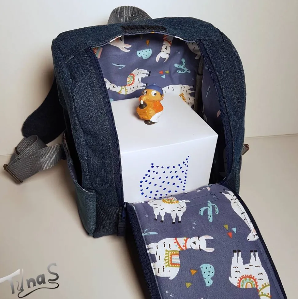 Der Rucksack hat die Maße 20 x 24 x 13 cm und ist u.a. aus einer alten Jeans genäht.