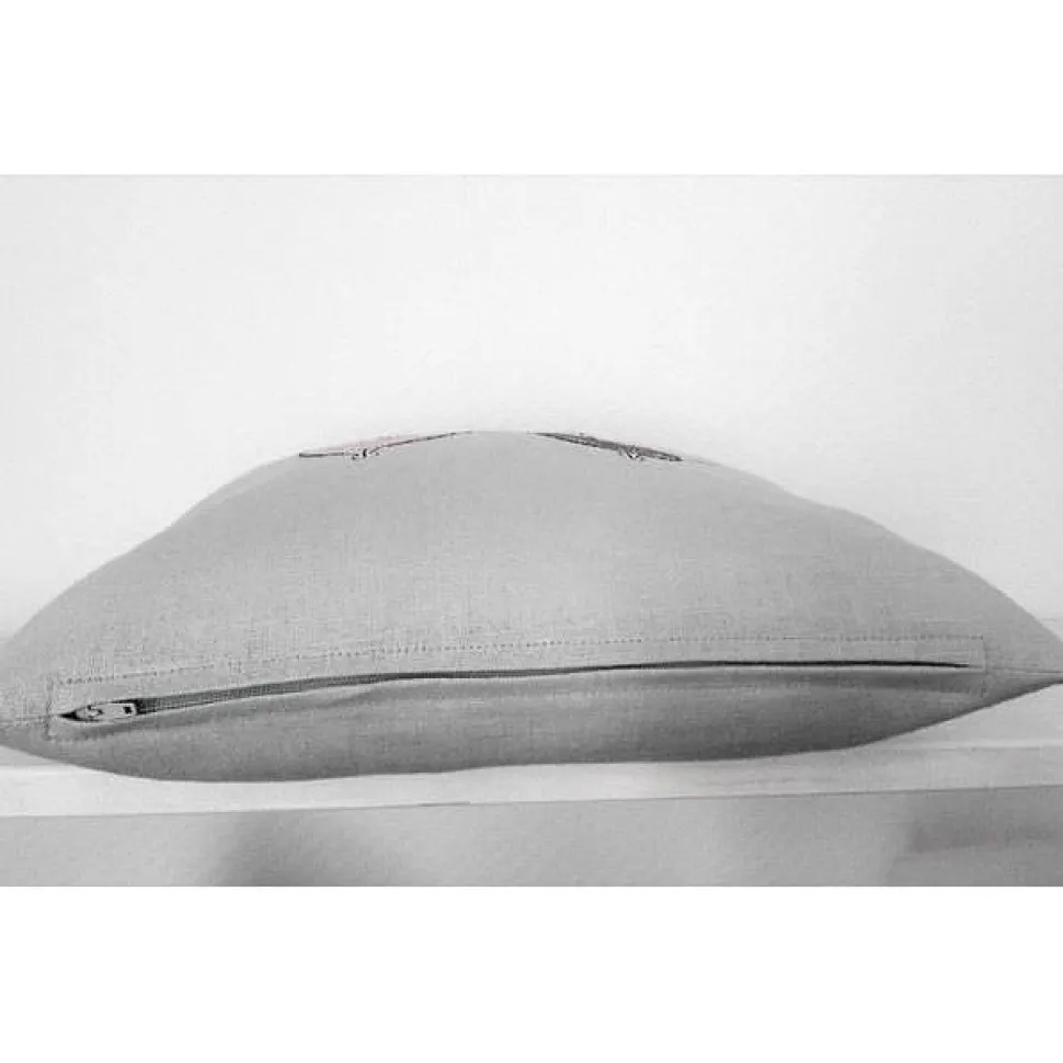 Der Bezug besteht aus grauen Leinen und ist bestickt.