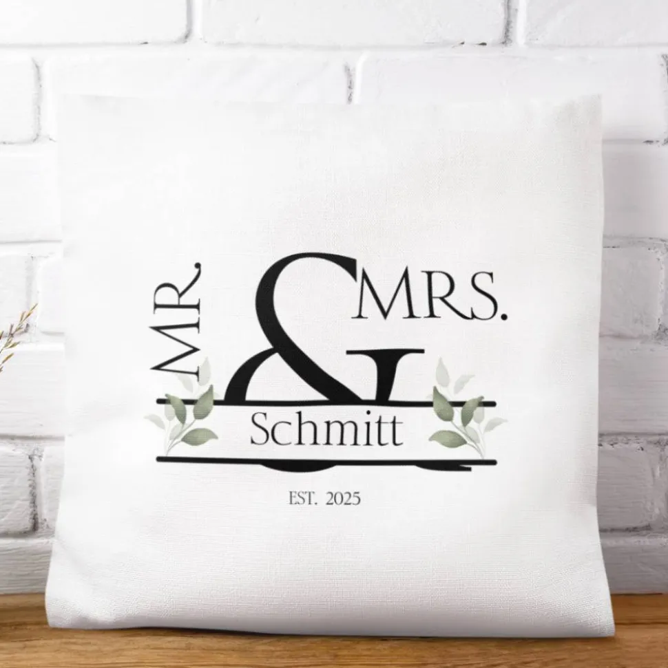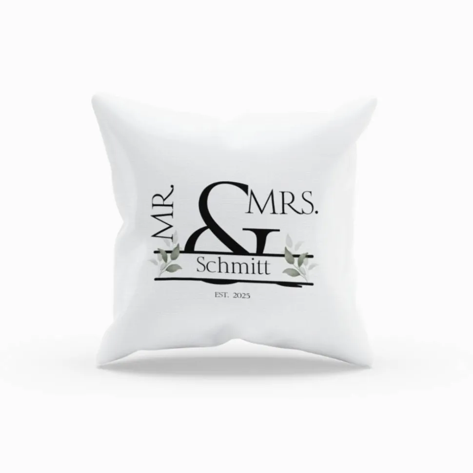 Dieses elegante Hochzeitskissen „Mr & Mrs.“ ist die perfekte Geschenkidee für frisch verheiratete Paare oder Jubiläen. Das edle Design zeigt den Schriftzug Mr & Mrs. in stilvoller Typografie, ergänzt durch den Familiennamen sowie ein Gründungsjahr (Est. 2025 als Beispiel). Zarte Blätterornamente runden das Motiv harmonisch ab. Durch die Personalisierung mit Namen und Datum wird jedes Kissen zu einem ganz besonderen Unikat.