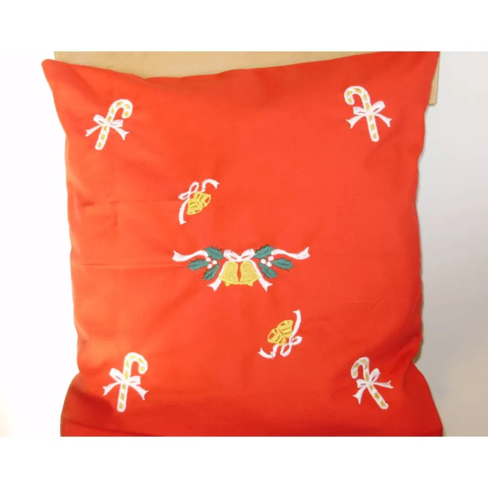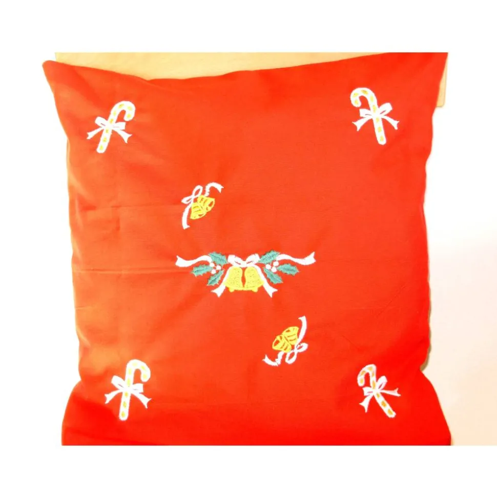 Die rote Kissenhülle ist mit weihnachtlichen, nostalgischen Stickmotiven, maschinell bestickt.