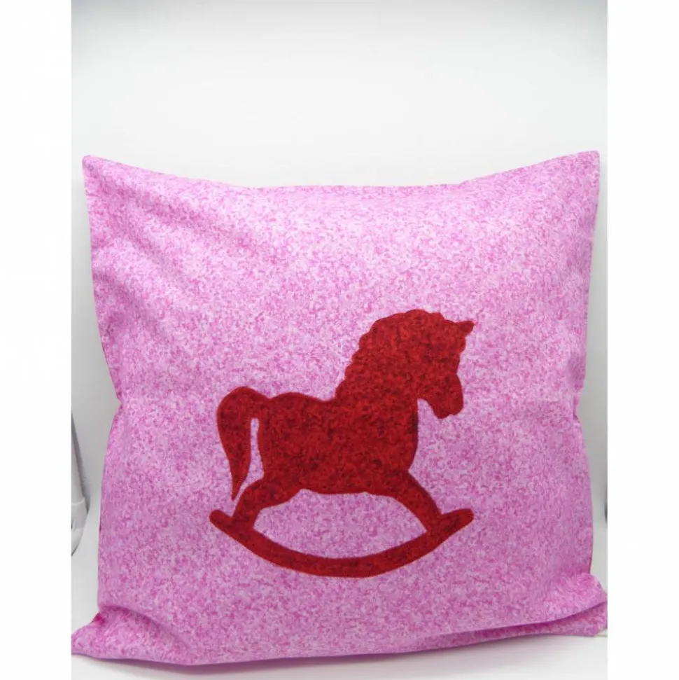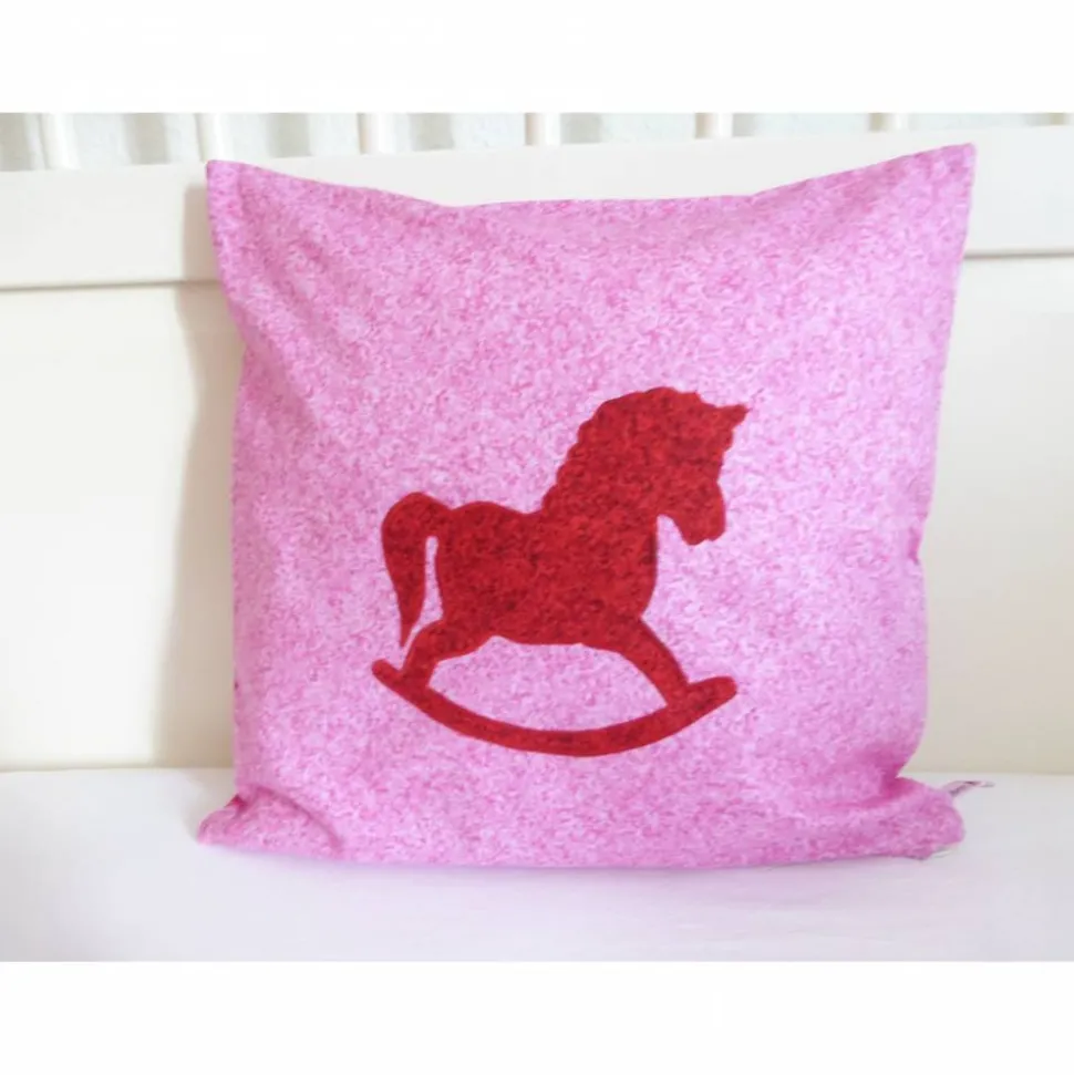 Ein rotes Schaukelpferd wurde hier liebevoll auf die rosa-farbene Kissenhülle appliziert.