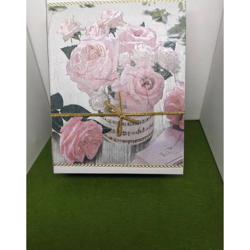 Mit Hilfe von Serviettentechnik und Klebeborte wurde diese Box verziert. Bei dieser Technik wird die Motivschicht von der Serviette getrennt, vorsichtig auf die Fläche geklebt und lackiert. Ein weiteres Gestaltungselement ist die goldene Klebeborte. Ein goldenes Gummiband umschließt die Geschenkebox. Die Innenflächen sind mit rosafarbenen Filz ausgelegt.