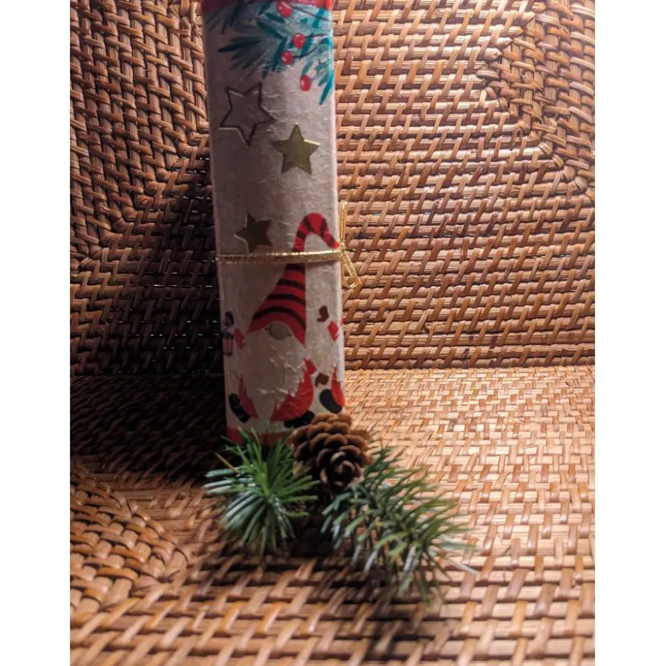 Bei dieser Technik wird die Motivschicht von der Serviette getrennt, vorsichtig auf die Fläche geklebt und lackiert. Ein weiteres Gestaltungselement sind die roten Klebestreifen und goldenen Aufkleber. Ein goldenes Gummiband umschließt die Geschenkebox.
